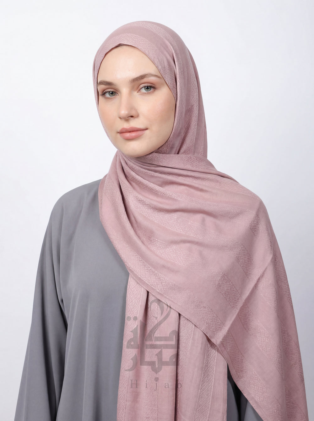 يتميز حجابنا المطبوع بتقنية الجاكار بتصميم فاخر يجمع بين نسيج الجاكار الهندسي وألواح القماش الناعمة. النقش منسوج وليس مطبوعاً، مما يمنح الحجاب لمسة نهائية راقية، ولمعاناً ناعماً، وملمساً دقيقاً وجميلاً.