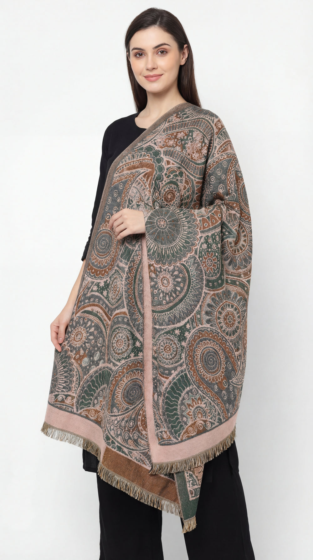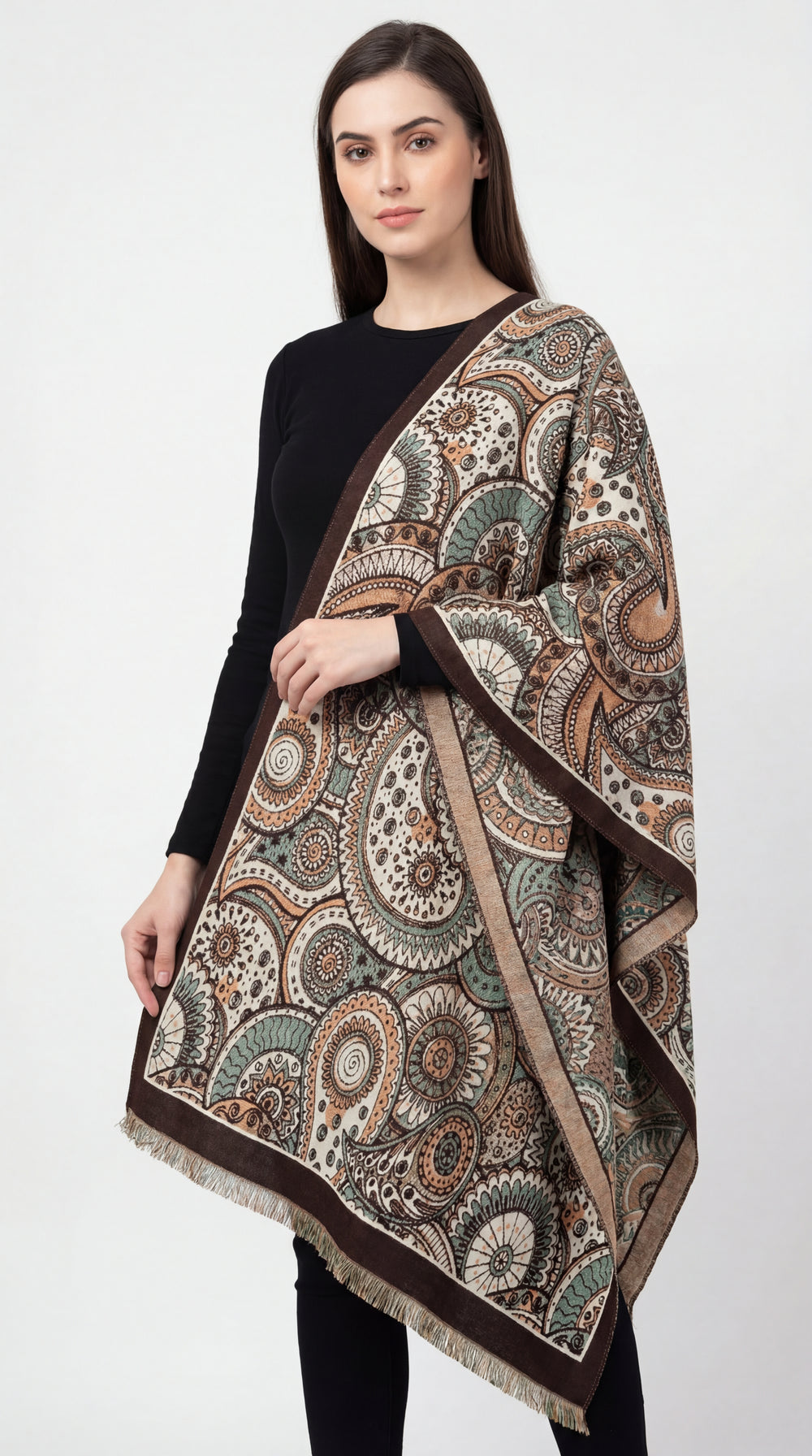 يتميز بنقشة أنيقة وألوان ترابية هادئة تجعله قطعة متعددة الاستخدام — مثالي للتنسيق مع العبايات، الإطلالات المحتشمة، الفساتين أو ملابس الشتاء. خفيف ودافئ في نفس الوقت، ليناسب الإطلالة من النهار إلى المساء.