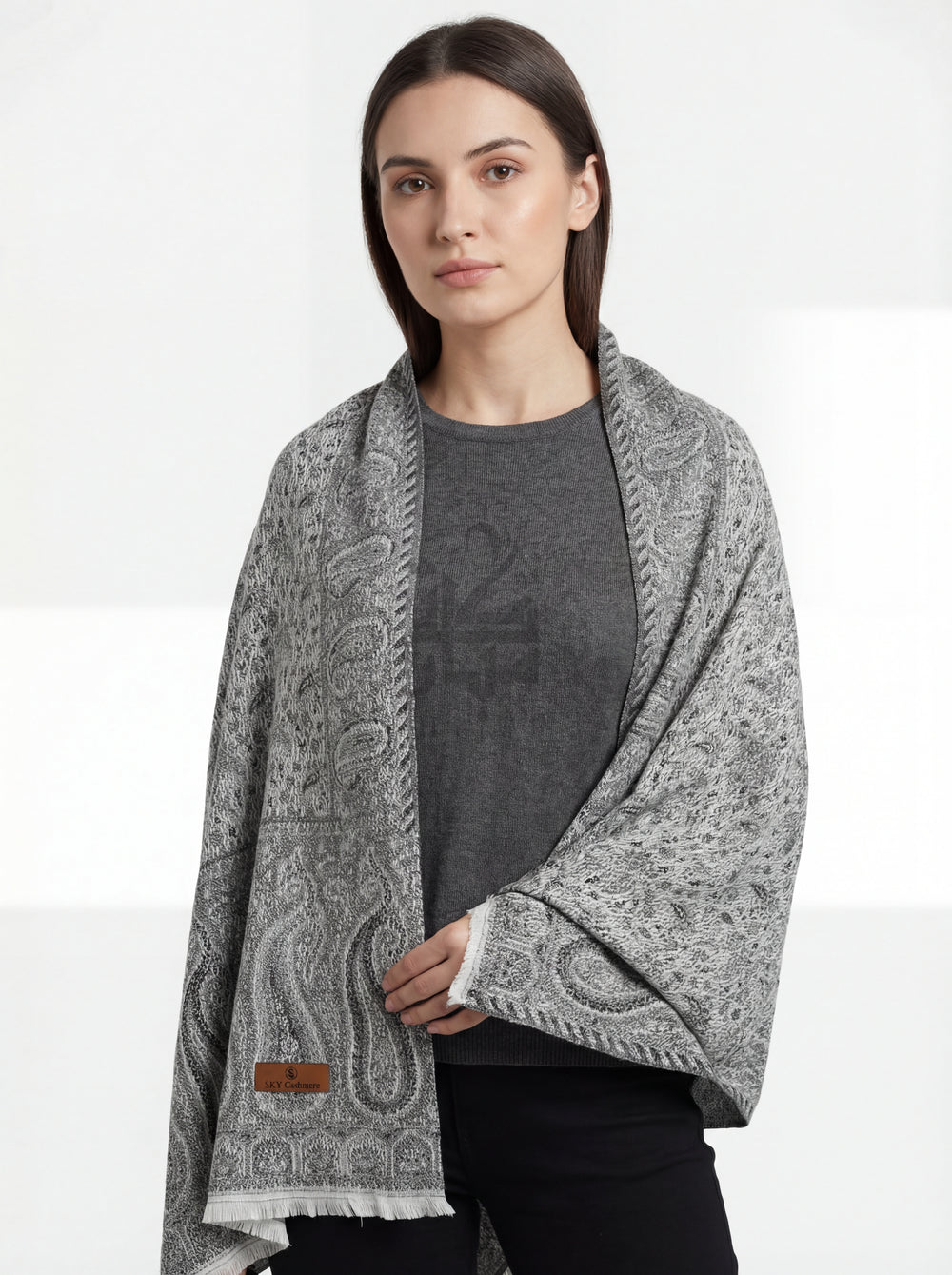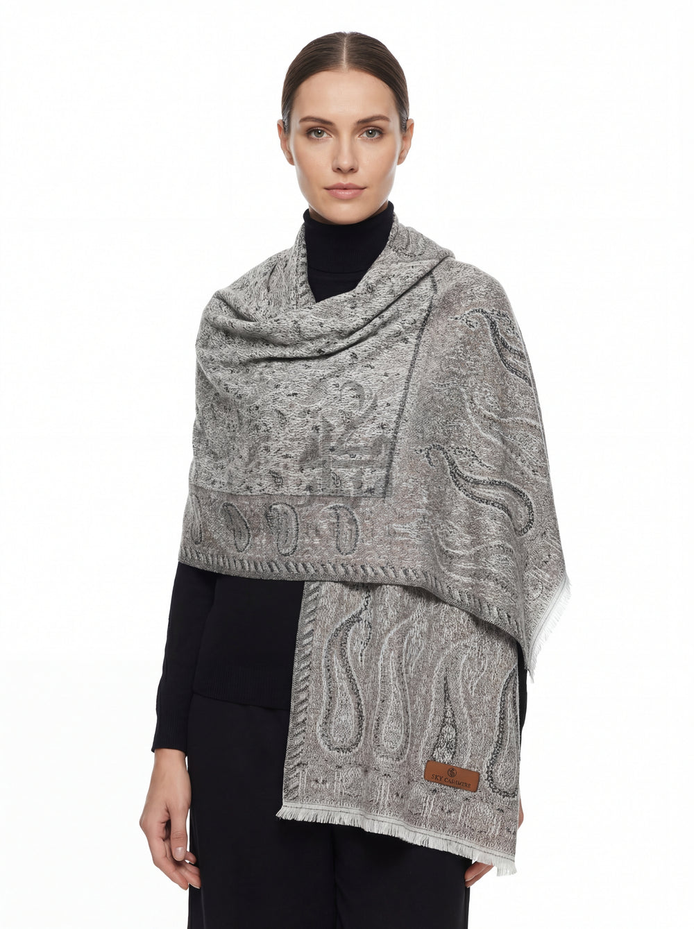 راقٍ، أنيق، وكلاسيكي بكل بساطة — يتميز شال نورا™ المميز بلون رمادي بارد ناعم مزخرف بـ نقشات بيزلي دقيقة بدرجات دافئة ترابية. تصميم يمنحك إطلالة تراثية فاخرة بلمسة عصرية أنيقة.