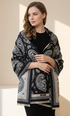 أنيق، ناعم وراقي بكل بساطة — شال كشمير روانا™ شال فاخر من مزيج الكشمير بتصميم كلاسيكي بنقشة بيزلي مع ألوان هادئة وعصرية. اللون الرمادي الداكن متوازن بشكل جميل مع تفاصيل البيزلي الكريمية وحافة ناعمة تضيف لمسة فخامة راقية.